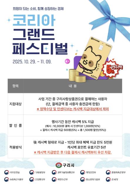 [뉴스노크=김인호 기자] 구리시는 오는 10월 29일부터 11월 9일까지 열리는 ‘2025 코리아 그랜드 페스티벌’ 기간 동안 구리사랑상품권 5% 추가 적립금 사업을 추진한다고 밝혔다.