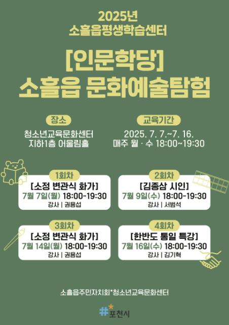 소흘읍을 대표하는 예술인인 김종삼 시인과 변관식 화가의 삶과 작품을 소개하고, 주민들이 지역 문화예술에 대한 자긍심을 고취할 수 있도록 기획됐다. 총 4회차로 구성된 강의는 청소년과 일반 주민을 대상으로 운영하며, 지역 내 숨어 있는 문화 자산을 재조명하는 강좌다.