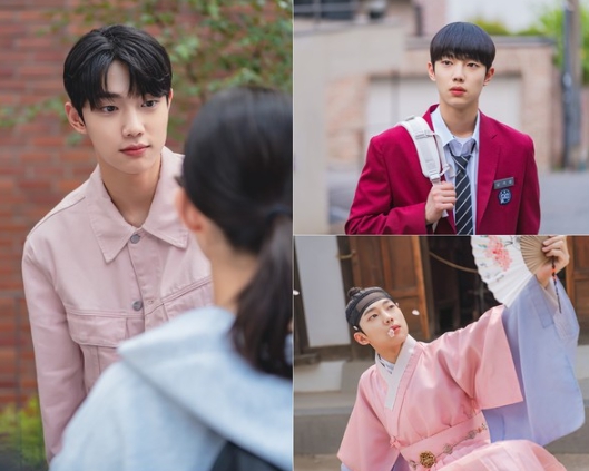 송우연을 향해 시선이 머무는 풋풋한 설렘의 순간부터, 붉은색 교복 차림으로 홀로 서 있는 청량한 청춘미, 그리고 그림 모임에서 콘셉트를 맞춰 입은 한복 차림으로 부채를 들고 장난스럽게 포즈를 취하는 장면까지, 세 컷만으로도 기정 특유의 자유분방한 에너지와 반전 매력은 물론 예상치 못한 순간마다 설렘을 유발하는 매력이 고스란히 드러난다.