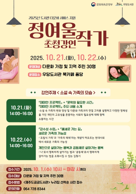 [뉴스노크=김인호 기자] 제주시 우당도서관은 2025년 도서관 다문화 서비스 지원 사업의 일환으로 ‘정여울 작가 초청 강연’을 오는 10월 21일과 22일 이틀간 북카페 퐁당에서 진행한다.