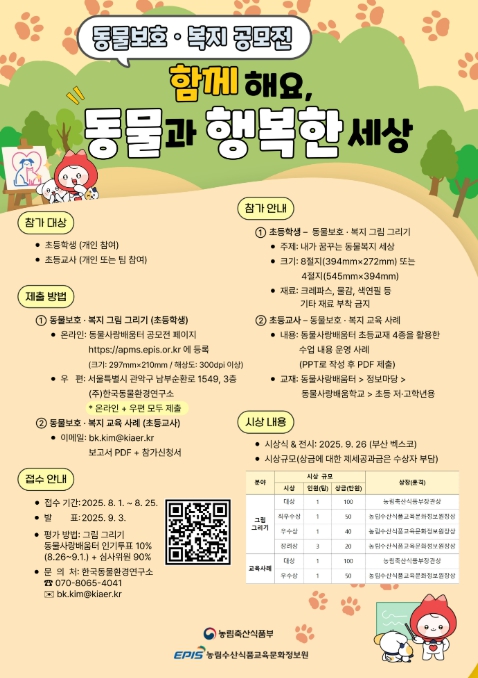 작품 접수는 2025년 8월 1일부터 8월 25일까지 할 수 있으며 참가 방법은 부문별로 ‘그림 그리기’ 부문은 초등학생이 ‘내가 꿈꾸는 동물복지 세상’을 주제로 그린 그림의 작품 이미지를 ‘동물사랑배움터’에 등록한 후 실물 원본을 우편으로 접수해야 한다.