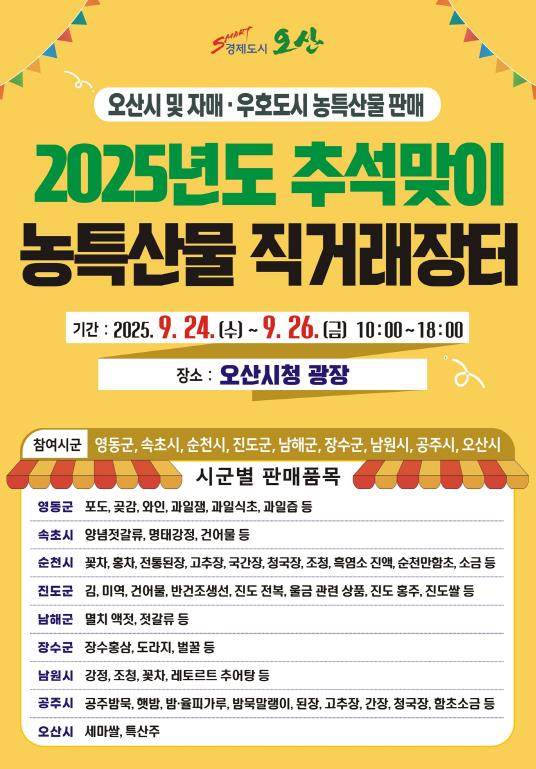 [뉴스노크=김인호 기자] 오산시는 민족 최대 명절 추석을 맞아 오는 24일(수)부터 26일(금)까지 3일간 오산시청 광장에서 ‘추석맞이 자매도시 농특산물 직거래장터’를 개최한다고 밝혔다.