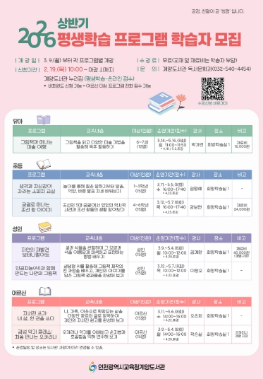[뉴스노크=김인호 기자] 인천광역시교육청계양도서관은 학생과 지역주민에게 다양한 배움과 자기계발의 기회를 제공하기 위하여 오는 19일부터 ‘2026년 상반기 평생학습 프로그램’학습자를 모집한다.