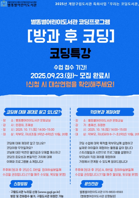 [뉴스노크=김인호 기자] 인천 계양구립별똥별어린이도서관은 2025년부터 실시된 초·중등학교 코딩교육 의무화에 따라 지역 아동들의 디지털 역량 강화를 위해 10월부터 코딩 특화사업 ‘방과 후 코딩’을 운영한다고 밝혔다.