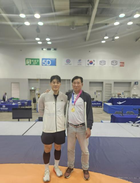| ▲ 레슬링부 윤창희 감독과 김현우 선수가 기념사진을 찍고 있다. |