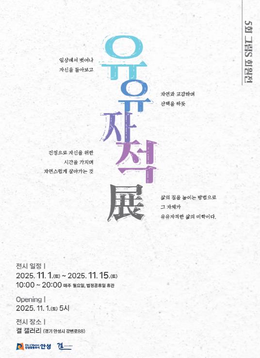 [뉴스노크=김인호 기자] 안성천 우리동네 작은미술관 결갤러리에서는 오는 11월 1일부터 15일까지 그림스아뜰리에 제5회 회원전 ‘유유자적’이 열린다. 이번 전시는 바쁜 일상 속에서 잠시 걸음을 멈추고, 자연과 교감하듯 마음을 산책하는 여유의 시간을 주제로 마련됐다.