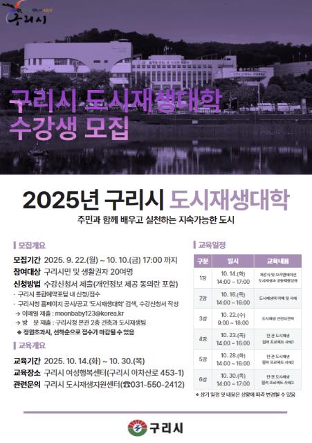 수강 신청은 9월 22일부터 10월 10일까지 구리시청 홈페이지 공시·공고 게시판에서 ‘도시재생 대학’을 검색해 수강신청서를 내려받아 작성한 뒤, 방문 접수 또는 이메일로 제출하면 된다.
