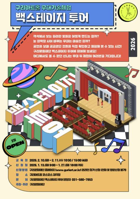 [뉴스노크=김인호 기자] 구리문화재단은 〈무대 기술 체험 백스테이지 투어 프로그램〉 참가자를 오는 1월 13일 오전 9시부터 1월 27일 오후 6시까지 재단 홈페이지를 통해 선착순 모집한다고 밝혔다.