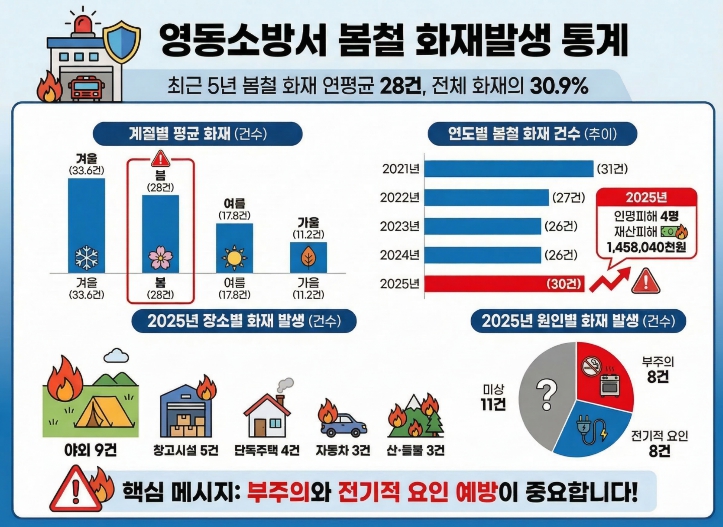 소방서에 따르면 영동지역의 최근 5년간(2021~2025년) 봄철 화재는 연평균 28건으로 전체 화재의 30.9%를 차지했으며, 2025년에는 30건이 발생해 4명의 부상자와 14억5천여만 원의 재산피해가 발생한 것으로 나타났다.