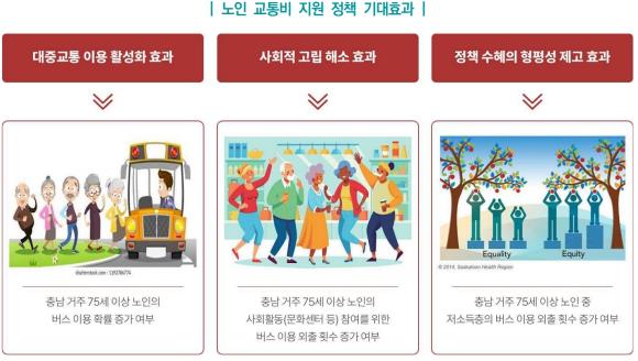 국민기초생활보장급여를 받는 충남의 75세 이상 노인은 정책 시행 이후 외출 시 버스를 이용할 확률이 대조군(충남 외 지역 비수급 대상인 75세 이상 노인)보다 약 2.5배 높았고, 버스 이용 외출 횟수도 월평균 3.95회 더 증가한 것으로 나타났다.