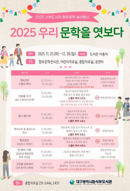 [뉴스노크=김인호 기자] 대구서부도서관은 11월 25일부터 12월 31일까지 2025년 한 해를 마무리하며 지역 문학에 대한 관심을 높이고 향토문학의 가치를 되새기기 위해 '2025 우리 문학을 엿보다' 송년행사를 운영한다.