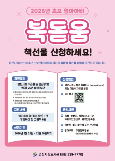 책 꾸러미는 육아정보 도서 1권과 영아 그림책 6권으로 구성됐다. 지원 대상은 영천시에 주소를 둔 임신부와 2026년 출산한 영아 부모로, 2025년 출산한 영아 부모 중 미신청자도 포함된다.