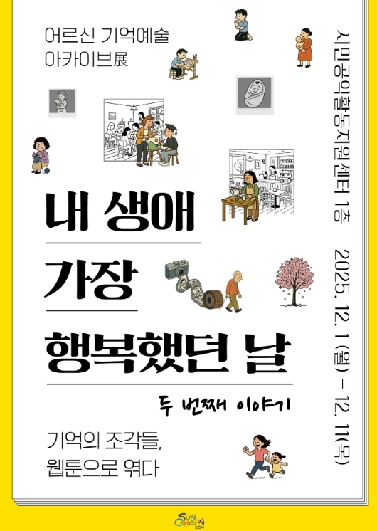 [뉴스노크=김인호 기자] 순천시가 오는 12월 1일부터 12월 11일까지 순천시 시민공익활동지원센터 1층 시민공익라운지에서 ‘어르신 기억예술 아카이브 전시회, 내 생에 가장 행복했던 날 두 번째 이야기’를 진행한다.