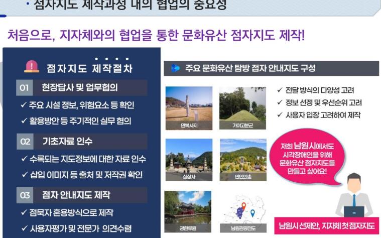 국토지리정보원과 남원시는 이번 남원 문화유적 점자 안내지도에서 시각장애인들이 남원의 대표 문화유산인 광한루원, 실상사, 만인의총, 가야고분군, 만복사지 5개소 문화‧유적지에 대한 구조와 특징을 직접 느껴며, 그 문화‧역사적 가치를 보다 깊게 이해하고 스스로 탐방할 수 있도록 점자와 돌출 형태의 촉각적 형태로 제작할 예정이다.