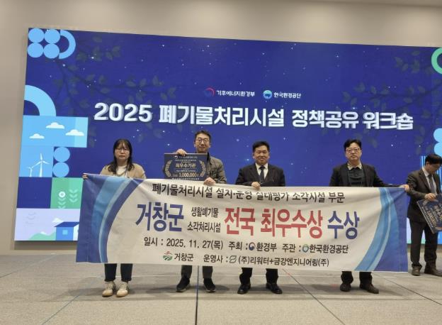 [뉴스노크=김인호 기자] 거창군은 지난달 27일 기후에너지환경부가 주관하고 한국환경공단이 시행한 2025년 폐기물처리시설 운영·실태 평가에서 전국 최우수시설로 선정됐다.