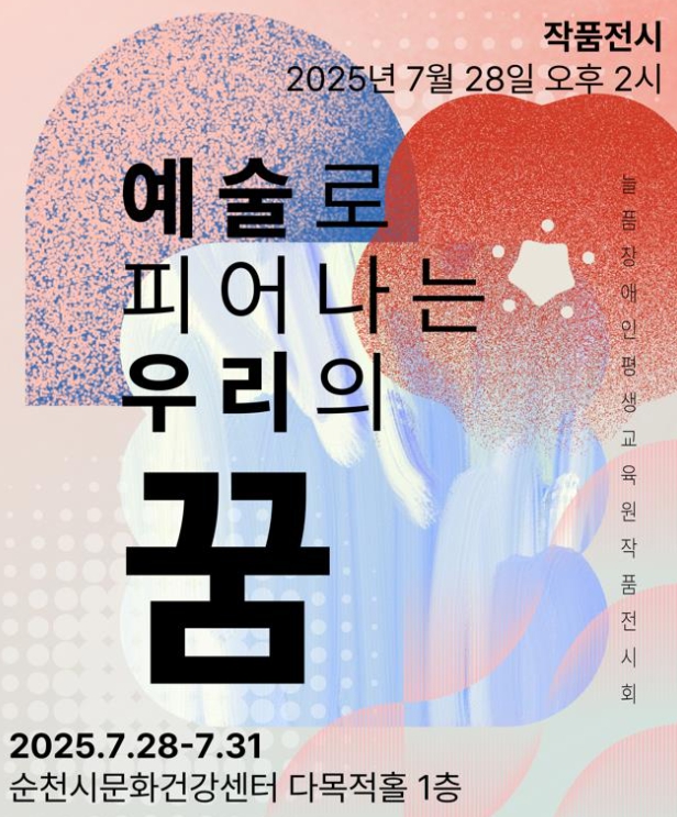 [뉴스노크=김인호 기자] 순천시는 늘픔장애인평생교육원이 오는 28일부터 31일까지 순천시문화건강센터에서 “예술로 피어나는 꿈”을 주제로 장애인 작품 전시회를 개최한다고 밝혔다.