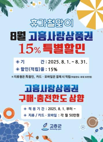 ▲ 고흥군, 8월 휴가철맞이 ‘고흥사랑상품권’ 15% 특별할인 판매 |