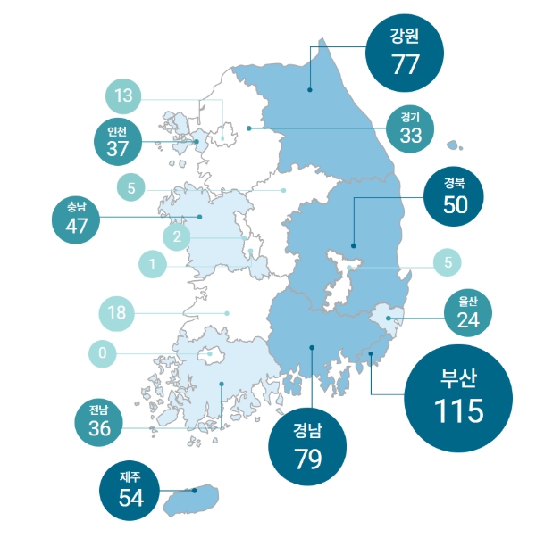 지역별로는 동해안과 남해안 주요 연안 지역이 위치한 시‧도에서 다수의 민원이 접수됐으며, 부산‧경남 등 상위 5개 시‧도가 전체 민원의 60%를 차지했다.