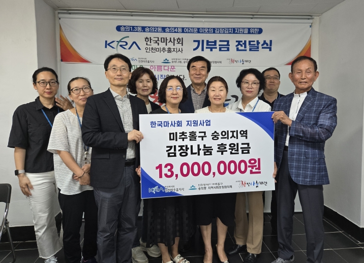 [뉴스노크=김인호 기자] 한국마사회 인천미추홀지사(지사장 조영진)는 미추홀구 숭의1·3동, 숭의2동, 숭의4동 일대 취약계층을 지원하기 위해 김장 나눔 후원금 1,300만 원을 학산나눔재단에 전달했다고 23일 밝혔다.