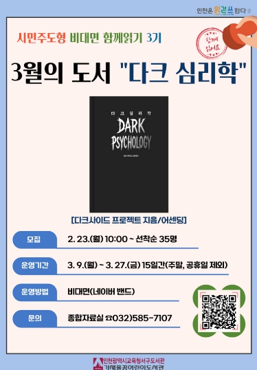 [뉴스노크=김인호 기자] 인천광역시교육청서구도서관은 2026년 시민주도형 비대면 함께읽기 3기 프로그램 ‘다크심리학 함께 읽기’ 참여자를 모집한다.