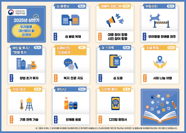 ‘반드시 우리말로 바꿔 써야 한다’는 응답이 가장 많았던 외국어는 ‘심 클로닝’이었다. 이는 ‘심(SIM) 카드의 정보를 복제해 같은 번호의 복제 심 카드를 만드는 방법’을 뜻하며, ‘심 불법 복제’로 다듬었다. 그 뒤를 이어 ‘퍼블릭 프로그램(대중 참여 활동/시민 참여 활동)’, ‘어질리티(반려동물 장애물 경주)’, ‘에인절 투자/엔젤오표기 투자(창업 초기 투자)’ 순으로 바꿔야 한다는 의견이 많았다.