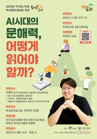[뉴스노크=김인호 기자] 부평구 부평구립도서관은 오는 9월 5일 부개도서관에서 2025년 ‘책 읽는 부평’ 독서문화 활성화 강연 ‘독서1교시’를 개최한다.