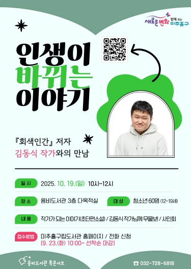 [뉴스노크=김인호 기자] 인천 미추홀구 용비도서관은 오는 10월 19일 청소년을 위한 특별한 북콘서트 ‘인생이 바뀌는 이야기’를 개최한다.