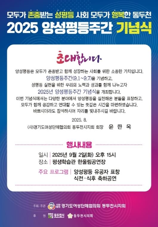 [뉴스노크=김인호 기자] 동두천시는 양성평등주간(9월 1일~7일)을 맞아 오는 9월 2일 오후 3시 평생학습관 한울림공연장에서 2025년 양성평등주간 기념식을 개최한다고 밝혔다.