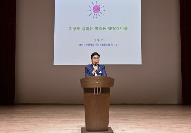 이번 강연은 ‘지구도 살리는 미호동 RE100’을 주제로, 에너지전환해유 사회적협동조합 양흥모 이사장이 강연을 진행했다. 양 이사장은 미호동에서 주민들과 함께 탄소중립(넷 제로)을 목표로 RE75를 달성하고, 100% 에너지 자립마을 조성을 위해 꾸준히 노력해온 실제 사례를 소개했다.
