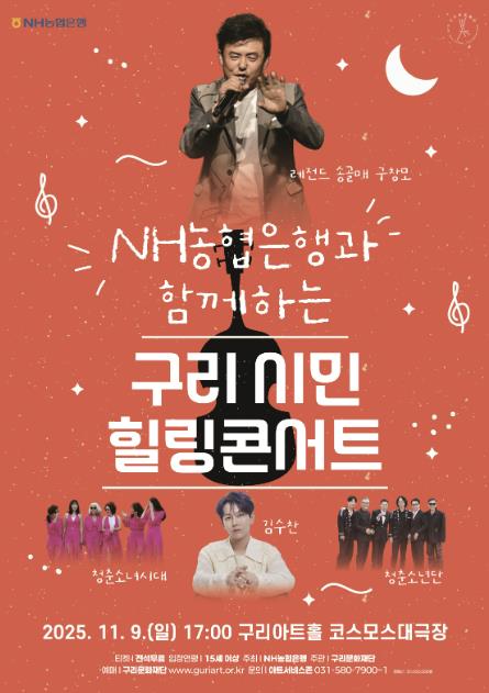 [뉴스노크=김인호 기자] 구리문화재단이 주관하고 NH농협은행 구리시지부가 주최하는 'NH농협은행과 함께하는 구리 시민 힐링 콘서트'가 오는 11월 9일 오후 5시, 구리아트홀 코스모스 대극장에서 열린다.
