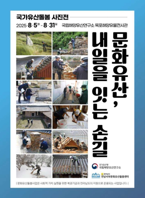 [뉴스노크=김인호 기자] 국가유산청 국립해양유산연구소는 8월 5일부터 31일까지 목포해양유물전시관 중앙홀(전남 목포시)에서 전남서부문화유산돌봄센터와 공동으로 국가유산돌봄 사진전 '문화유산, 내일을 잇는 손길'을 개최하고, 8월 5일 오후 2시에 개막식을 연다.