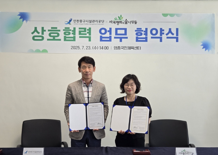 [뉴스노크=김인호 기자] 인천중구시설관리공단은 지난 23일 영종국민체육센터에서 환경보전과 ESG 경영 실천을 위한 협력 강화를 목적으로 비영리단체 ‘세계평화의숲사람들’과 업무협약(MOU)을 체결했다.