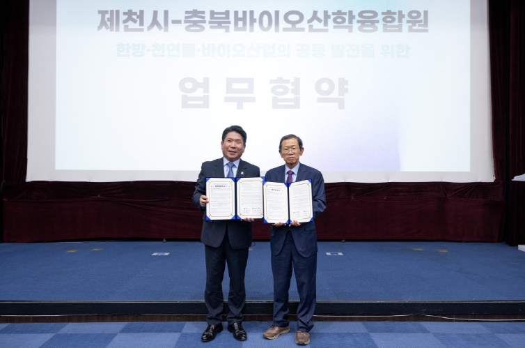 [뉴스노크=김인호 기자] 제천시는 9월 30일 ‘2025 제천국제한방천연물산업엑스포’ 기간 중 한방생명과학관 다목적강당에서 충북바이오산학융합원과 한방·천연물산업 발전을 위한 업무협약(MOU)을 체결했다.