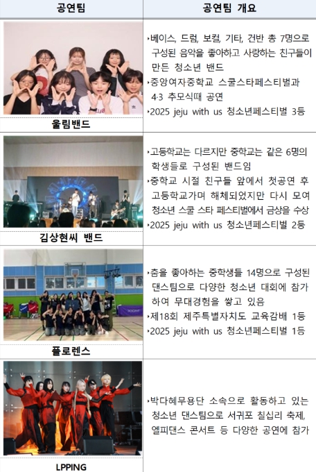 특히, 공연에 참가하는‘울림밴드’,‘김상현씨밴드’,‘플로렌스’, ‘LPPING’ 총 4팀 모두 중·고등학생 청소년들로 구성되어 있으며, 지난 7월 26일 ‘2025 jeju with us 청소년페스티벌’에서 수상을 한 팀들이다.