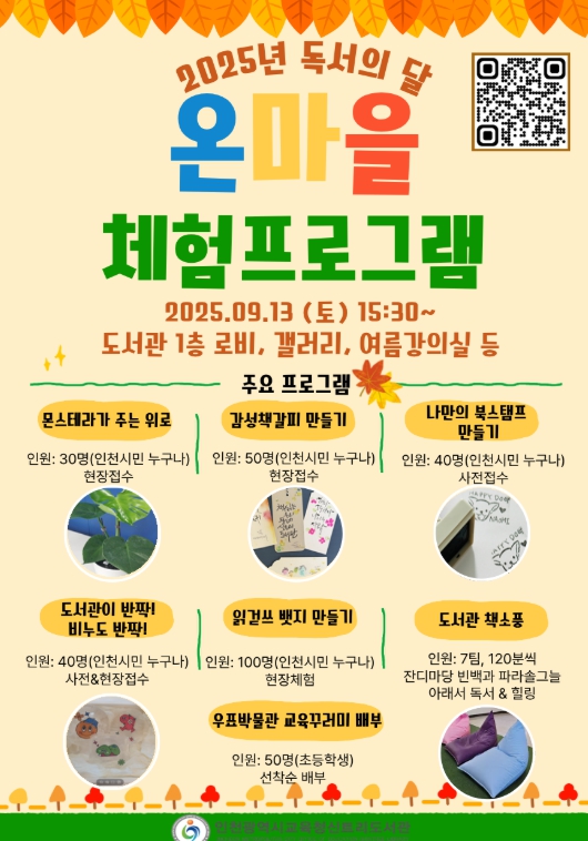 [뉴스노크=김인호 기자] 인천광역시교육청신트리도서관은 독서의 달을 맞아 독서 활성화와 지역 문화 교류를 위해 ‘2025 온마을축제’를 13일에 개최한다.