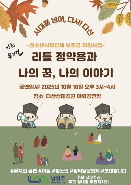 [뉴스노크=김인호 기자] 남양주시는 오는 10월 18일 조안면 다산생태공원에서 아동·청소년 대상 가족뮤지컬인 ‘리틀 정약용’을 선보인다.