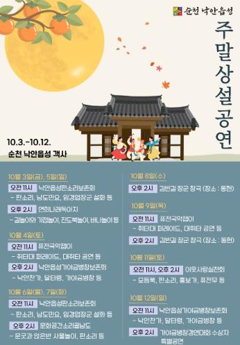 [뉴스노크=김인호 기자] 순천시는 순천 낙안읍성에서 '주말 상설공연'과 '김빈길 장군 창극' 공연을 오는 10월 3일부터 12일까지 선보인다고 밝혔다.