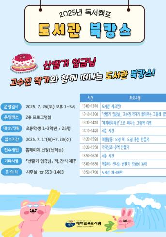 [뉴스노크=김인호 기자] 태백교육도서관은 오는 7월 26일 여름방학을 맞아 초등학교 1~3학년 25명을 대상으로 2025년 독서캠프 ‘도서관 북캉스’를 운영한다.