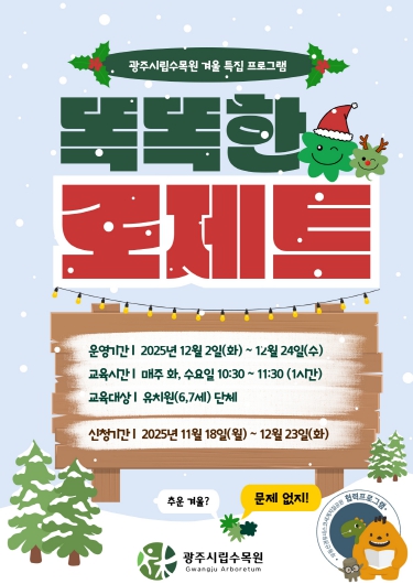[뉴스노크=김인호 기자] 광주광역시립수목원은 오는 12월 2일부터 24일까지 수목원 방문자센터에서 6~7세 어린이단체를 대상으로 체험형 교육프로그램 ‘똑똑한 로제트’를 운영한다.