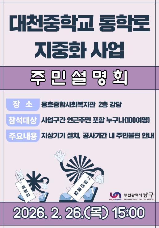 [뉴스노크=김인호 기자] 부산 남구는 '대천중학교 통학로 지중화사업'과 관련해 오는 2월 26일 오후 3시, 용호종합사회복지관 2층 강당에서 1차 주민설명회를 개최한다.