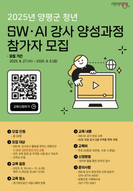 [뉴스노크=김인호 기자] 양평군은 청년들의 디지털 역량 강화를 통해 미래형 일자리 진입을 지원하고자, ‘2025년 양평군 청년 소프트웨어(SW)·인공지능(AI) 강사 양성과정’을 9월부터 본격적으로 운영한다고 밝혔다.
