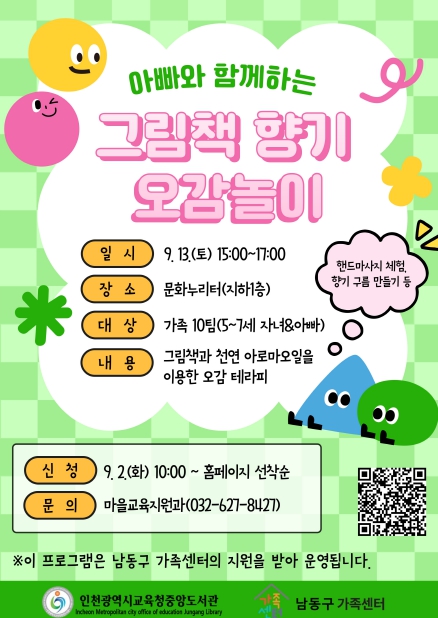 [뉴스노크=김인호 기자] 천광역시교육청중앙도서관은 9월 13일 ‘아빠와 함께하는 그림책 향기 오감놀이’ 프로그램을 운영한다고 밝혔다.