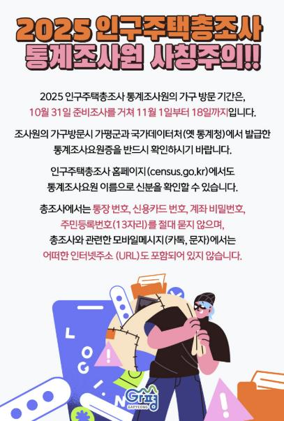 [뉴스노크=김인호 기자] 가평군은 국가데이터처(옛 통계청)가 주관하는 ‘2025 인구주택총조사’가 진행됨에 따라, 조사원을 사칭한 보이스피싱 및 개인정보 유출 피해에 대한 각별한 주의를 당부했다.