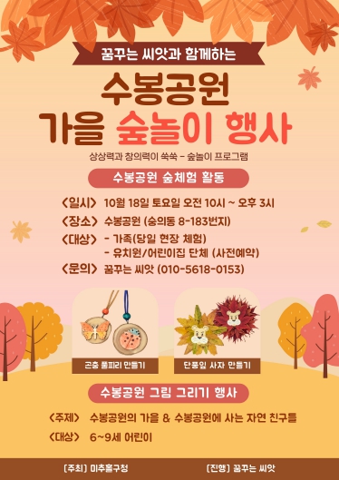 구 관계자는 “이번 가을 숲 놀이 행사를 통해 가족이 함께 가을의 정취를 느끼며 소중한 추억을 쌓고, 아이들은 자연 속에서 배우고 성장하는 뜻깊은 시간을 보내길 바란다.”라고 말했다.