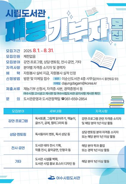 ▲ ‘여수시립도서관 재능기부자 모집’ 포스터 |