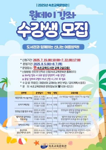 [뉴스노크=김인호 기자] 속초교육문화관은 관내 초등학생과 중학생을 대상으로 ‘2025년 원데이 강좌’ 수강생을 모집한다.