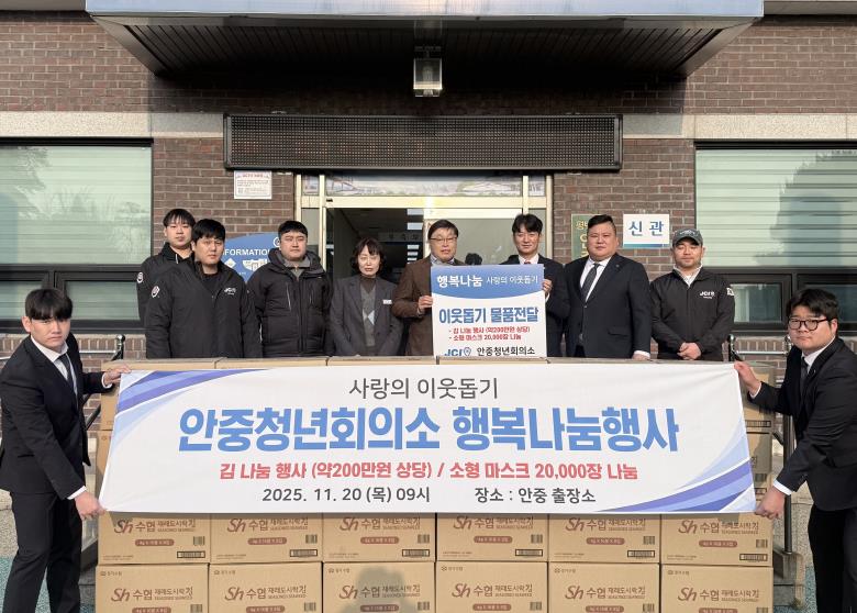 문종호 안중출장소장은 “어려운 이웃을 위한 따뜻한 나눔을 실천하신 청년회의소에 깊이 감사드린다”며 “후원 물품이 필요한 곳에 잘 전달될 수 있도록 최선을 다하겠다”고 전했다.