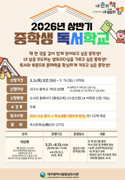 수강신청은 3월 15일까지 선착순으로 달성도서관 누리집을 통해 가능하며, 평소 독서에 관심이 있거나 문해력을 높이고 싶은 중학생이라면 누구나 참여할 수 있다.