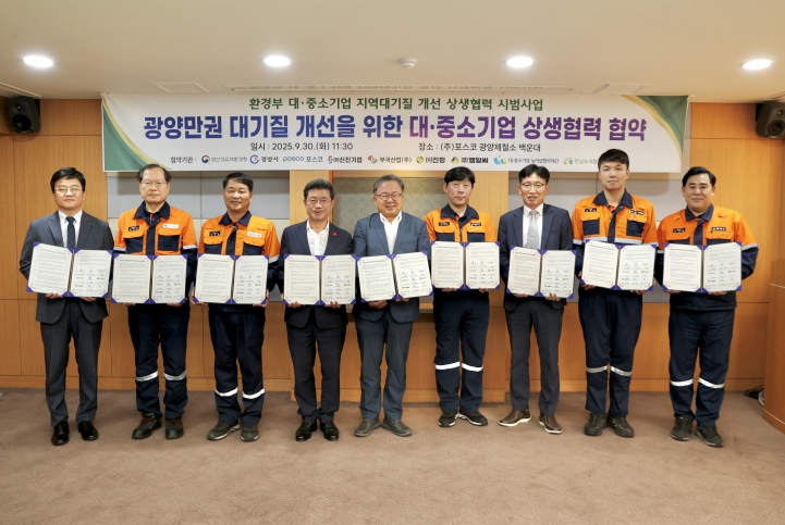 [뉴스노크=김인호 기자] 광양시와 영산강유역환경청은 9월 30일 국내 최대 철강업체인 ㈜포스코 광양제철소와 협력업체 4개사가 광양만권 지역 대기질 개선을 위해 ‘광양만권 대․중․소기업 지역 대기질 개선 상생협력 협약’을 체결했다고 밝혔다.