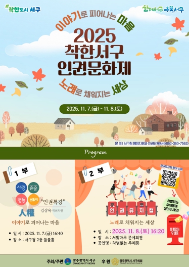 [뉴스노크=김인호 기자] 광주광역시 서구가 주민 참여 기반 인권문화 정착에 박차를 가한다. 서구는 오는 7일과 8일 이틀간 ‘이야기로 피어나는 마음, 노래로 채워지는 세상’을 주제로 ‘2025 착한서구 인권문화제’를 개최한다.